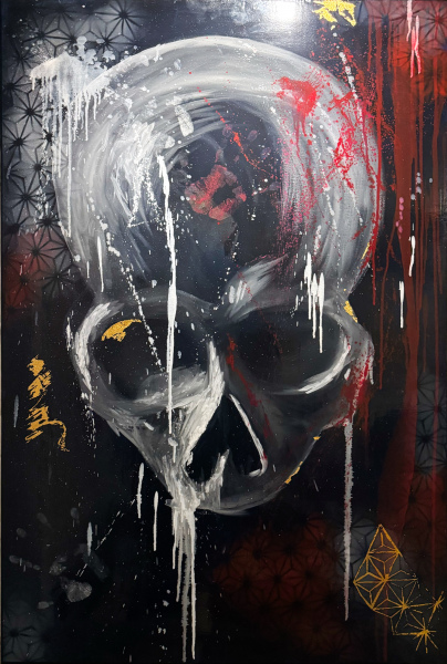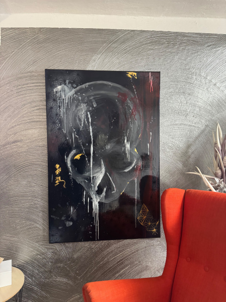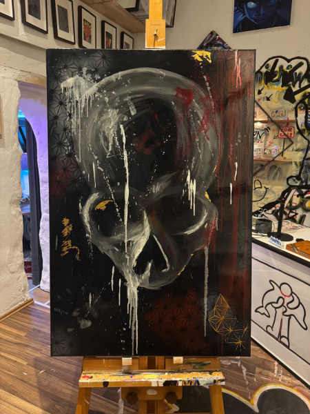 Ein kraftvolles Ölgemälde, das mit Tiefe und Kontrasten spielt. Auf tiefschwarzem Hintergrund erhebt sich ein Schädel, umgeben von dezenten, kaum wahrnehmbaren geometrischen Formen, die sich nur bei genauem Hinsehen offenbaren.