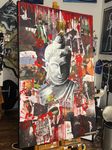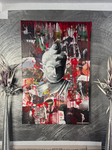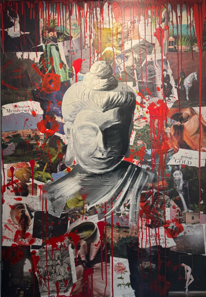Eine Collage aus Zeitschriftenseiten, die Konsumgüter und Oberflächenwerte zeigt, bildet den Hintergrund dieses Werks. Darüber läuft eine Schicht roter Farbe, die wie Blut von oben herabläuft. In der Mitte ist schemenhaft ein Buddha angedeutet, der still inmitten der aufgeladenen Komposition verweilt.