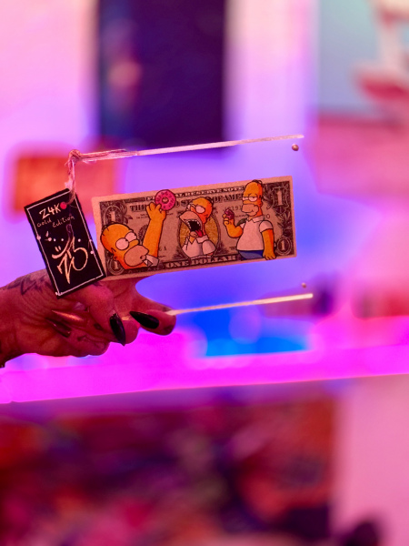 Dieser handgefertigte Dollar-Schein aus dem Jahr 2024 ist ein echter Hingucker. In der Mitte ist Homer Simpson zu sehen, wie er sehnsüchtig nach seinem Donut lechzt, während im Hintergrund 24 Karat Blattgold kunstvoll eingearbeitet wurde.