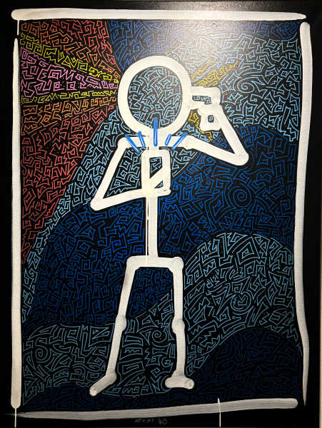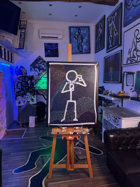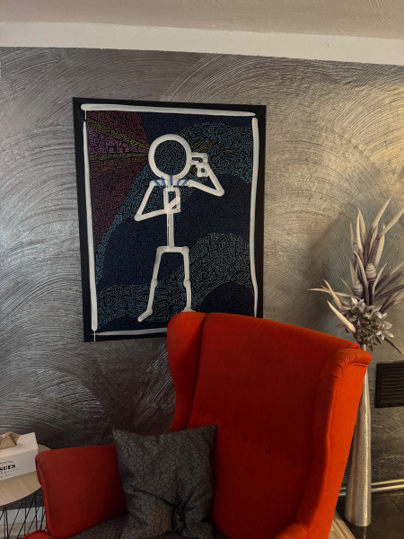 Dieses Leinwandbild im Hochformat (Maße: 80 x 120 cm, ca. 4 cm tief) zeigt die Silhouette eines Strichmännchens, das kindlich-naiv gehalten ist. In einer Hand hält es ein Handy, während es sich mit der anderen Hand eine Waffe an den Kopf hält. Auf der gegenüberliegenden Seite des Kopfes explodiert die Szene in einem abstrakten Farbenspiel – eine Mischung aus Blut, Gehirn und kreativen Elementen, die in lebendigen und chaotischen Strichen dargestellt sind. Dieses Bild verbindet Minimalismus mit einer starken, verstörenden Aussage über den Druck der modernen Welt, Selbstzerstörung und den Verlust kreativer Freiheit. Ein kraftvolles Werk, das zugleich provoziert und zum Nachdenken anregt.