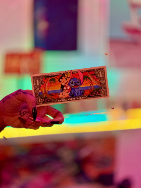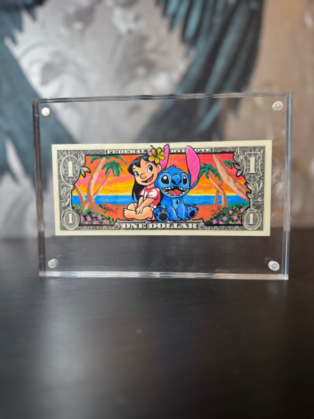 Dieses kunstvoll gestaltete Motiv auf einem Dollar-Schein aus dem Jahr 2024 bringt den Spirit von „Ohana“ – das Gefühl von Familie und Zusammenhalt – perfekt zum Ausdruck. In der Mitte des Scheins sitzen Lilo und Stitch, vereint in einem Moment der Freundschaft und Geborgenheit.