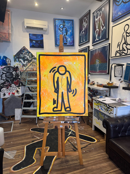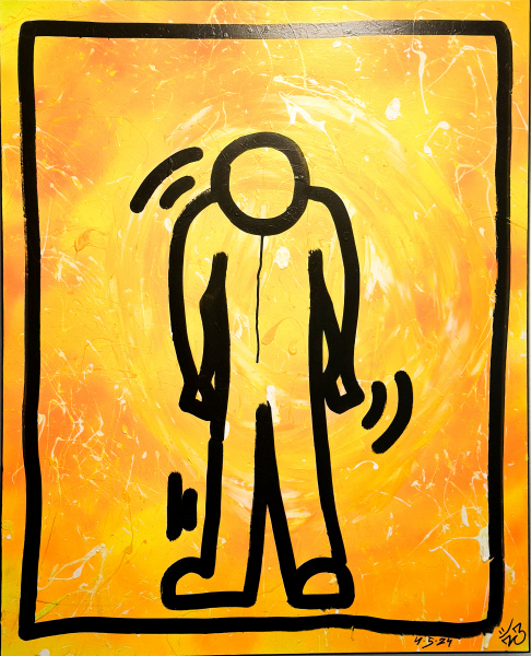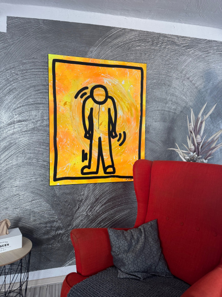 Ein Bild voller innerer Spannung und unausgesprochener Emotionen. Der Hintergrund leuchtet in intensiven Gelb- und Orangetönen, durchzogen von dynamischen Farbspritzern, die den Kontrast zwischen Energie und innerer Zerrissenheit verstärken.