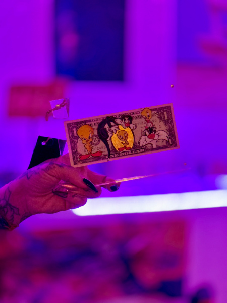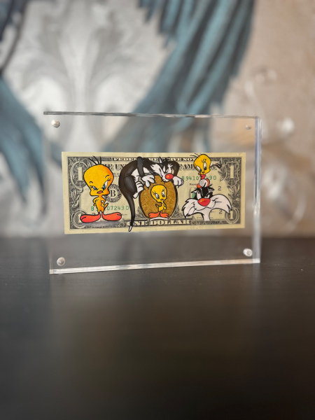 Dieser handgefertigte Dollar-Schein aus dem Jahr 2024 bringt Humor und Spannung auf den Punkt. In der Mitte steht Tweety, scheinbar unschuldig, umgeben von 24 Karat Blattgold, das ihn in den Mittelpunkt rückt. Über ihm lauert Silvester mit hungrigem Blick, bereit, im nächsten Moment zuzuschlagen.