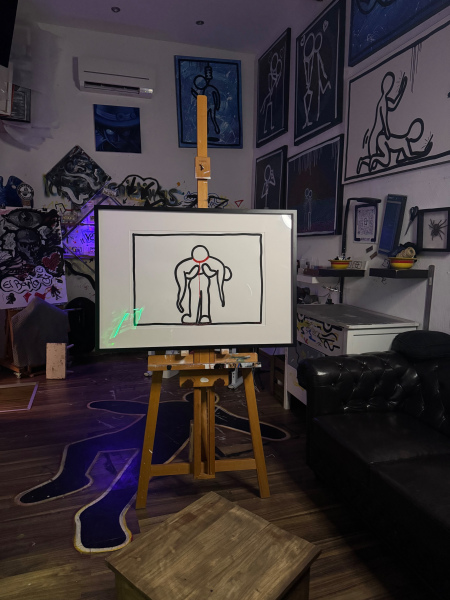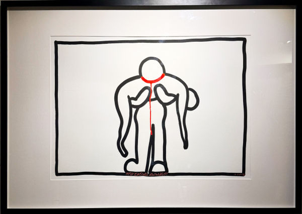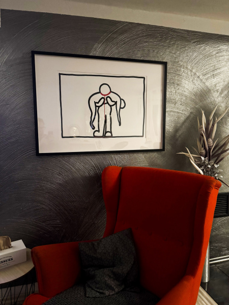 Dieses provokante Kunstwerk auf Papier (ca. 80 x 60 cm) trägt den Titel "Stop Eating Animals" und zeigt die Silhouette eines Menschen, dargestellt durch dicke schwarze Umrisse. Die Figur steht aufrecht und hält einen anderen Menschen mit beiden Händen vor sich, während sie in ihn hineinbeißt. Die Bissstelle wird durch eine kräftige rote Linie dargestellt, von der rote Farbe herabläuft, die an Blut erinnert und die Dramatik der Szene verstärkt.